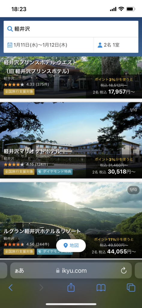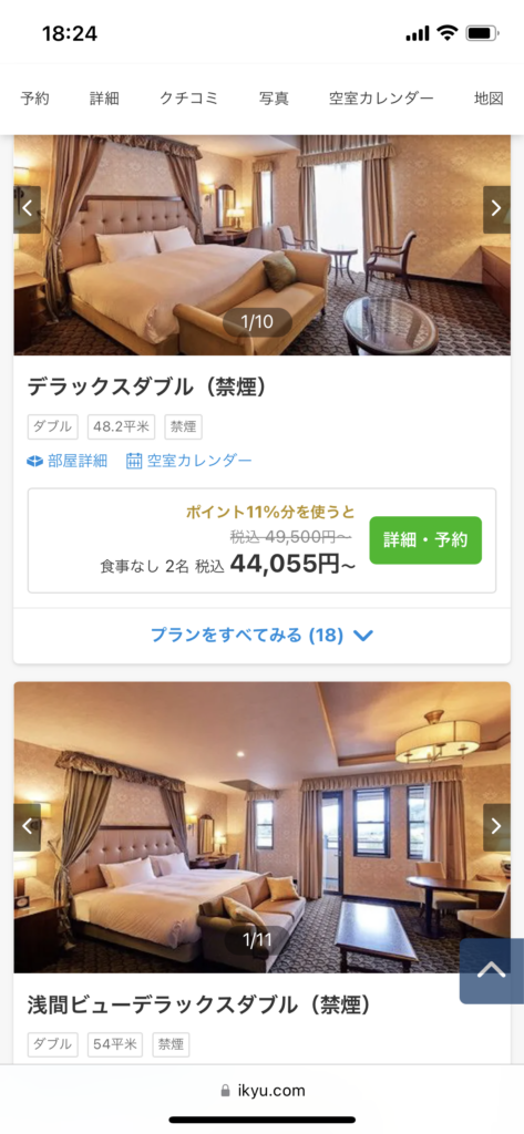 ここで気になるホテルが出てきたら、一休に戻って検索をします。