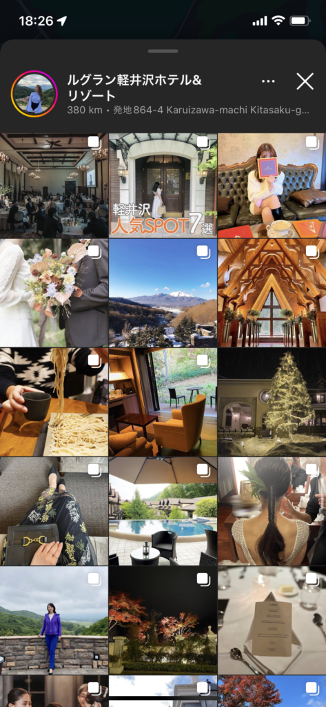 ここで注意なのですが、Instagramではホテルの名前を入力すると、