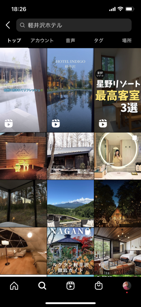 次に、リストアップしたホテルを全部Instagramで検索します。