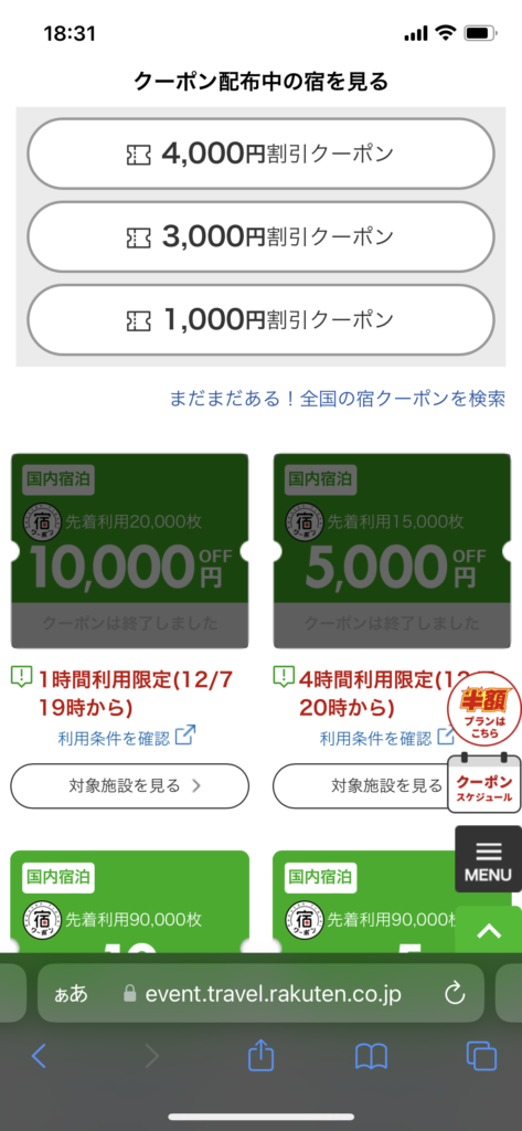 一休は割引%と、あとは限定タイムセールがあればかなりお安くはなるのですが、