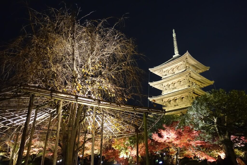 やっぱり東寺といえば、な五重塔のライトアップは黄金に輝いていて美しいです。